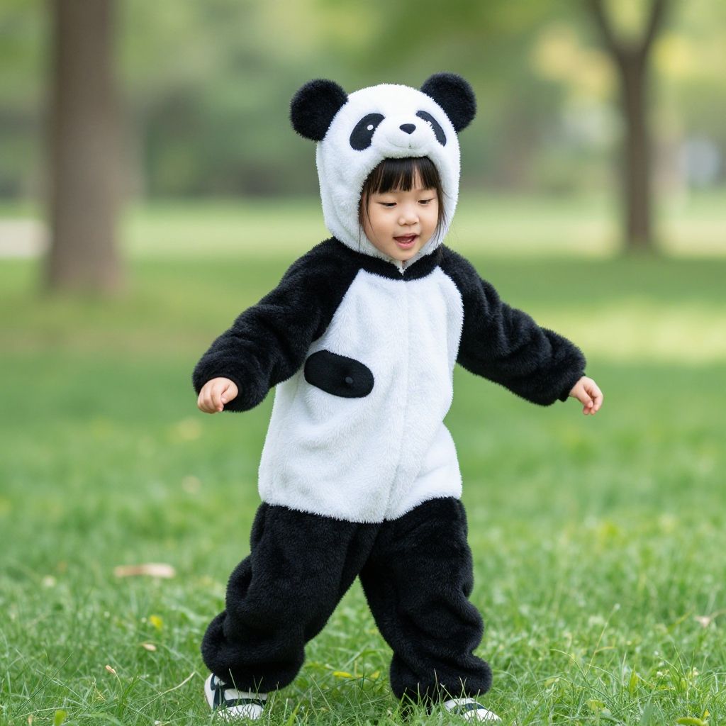 Asian little girl wearing a cute panda costume, playing in a lush green park, soft dappled sunlight, joyful and playful, candid moment capturing childhood innocence