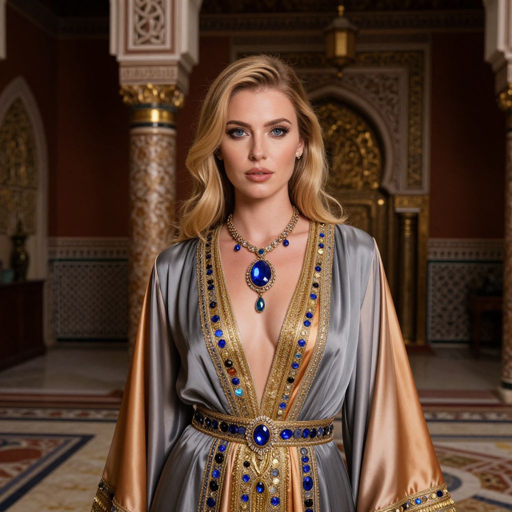 In this highly detailed and photorealistic image, a woman with striking blue eyes and blonde hair is elegantly dressed in a luxurious high-fashion silk dress. The dress is a striking combination of grey and pastel ochre hues, adorned with intricate Ultramarine and gold gilded details that add a regal touch. Her attire is complemented by a voluminous necklace featuring a large, vibrant blue gemstone, which stands out against the soft tones of her dress. The setting is a grand, dark-themed Moroccan riad, characterized by its rich, warm colors and intricate architectural details. The background is dominated by a large, ornate column with gold accents, and the space is illuminated by soft, volumetric lighting that enhances the depth and texture of the scene. The overall composition is epic and cinematic, with the woman positioned in the foreground, her gaze directed towards the viewer, creating a sense of connection and intrigue. The image is a testament to the power of photorealism, capturing every nuance of the scene with precision and detail.