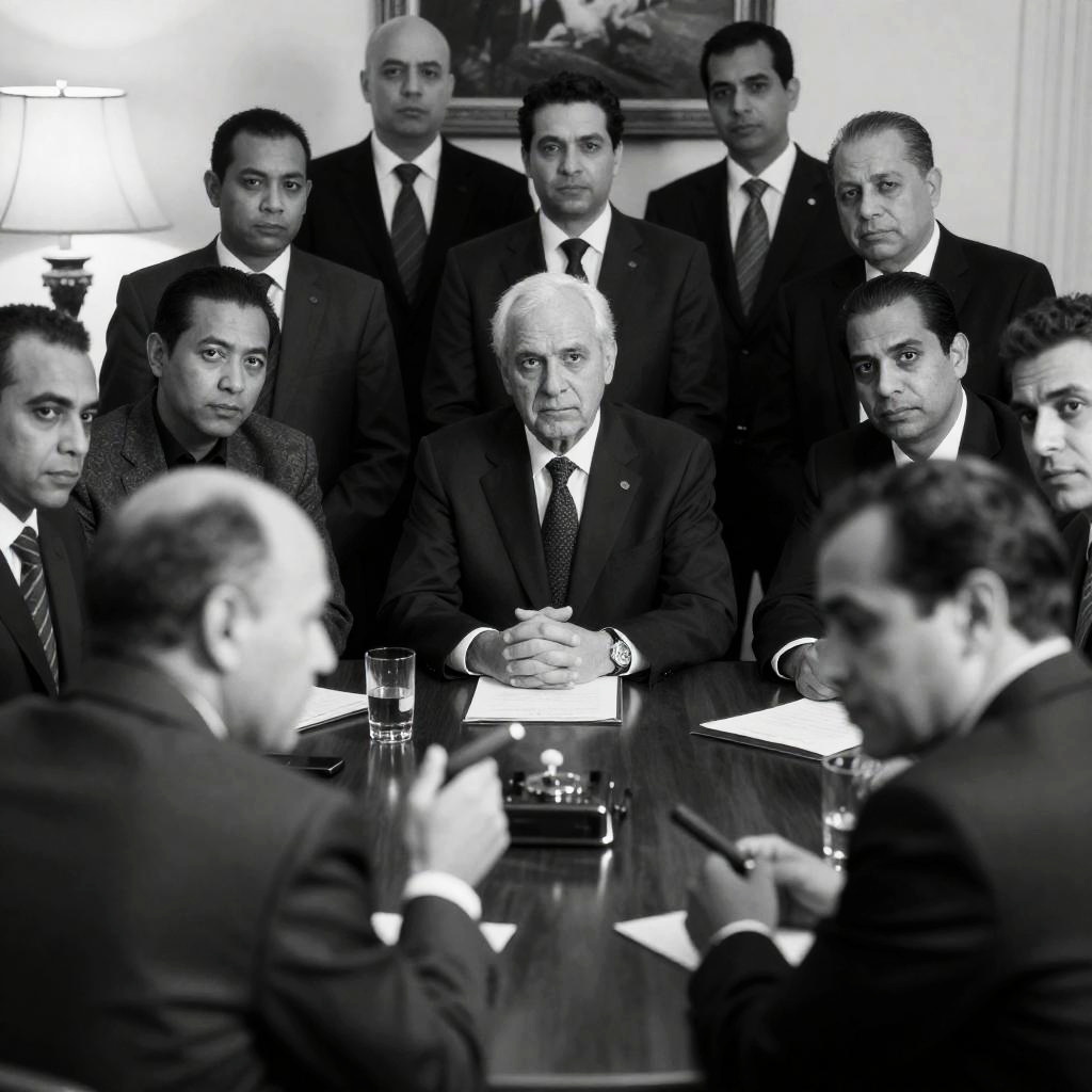 Black and white photograph of eleven men in suits, gathered around a conference table. Foreground man with bald head and cigar gestures, others have intense expressions. Background has lamp and wall decor. Men in center and right wear dark suits. Foreground man wears patterned jacket. Lighting from lamp on left. Men vary in expressions from serious to slightly amused.