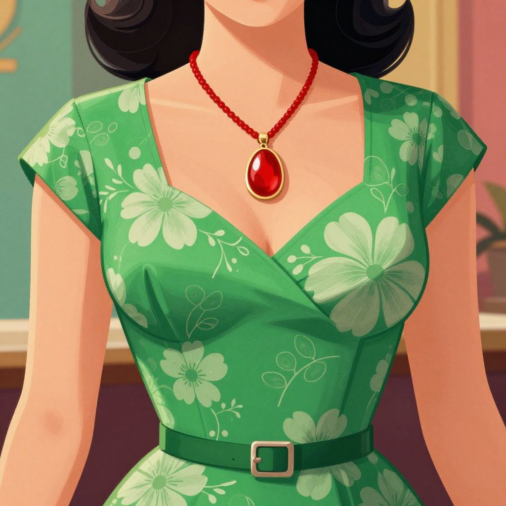 A vibrant digital illustration in the classic pin-up style, reminiscent of Zoë Mozert's work, featuring a woman in a floral-patterned green dress adorned with a red pendant necklace, set against a soft, vintage-inspired backdrop with dramatic lighting.