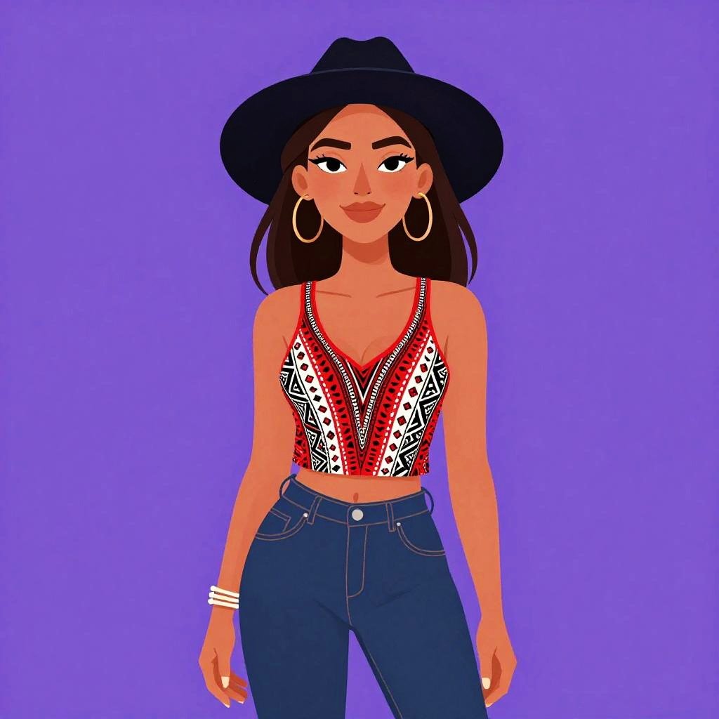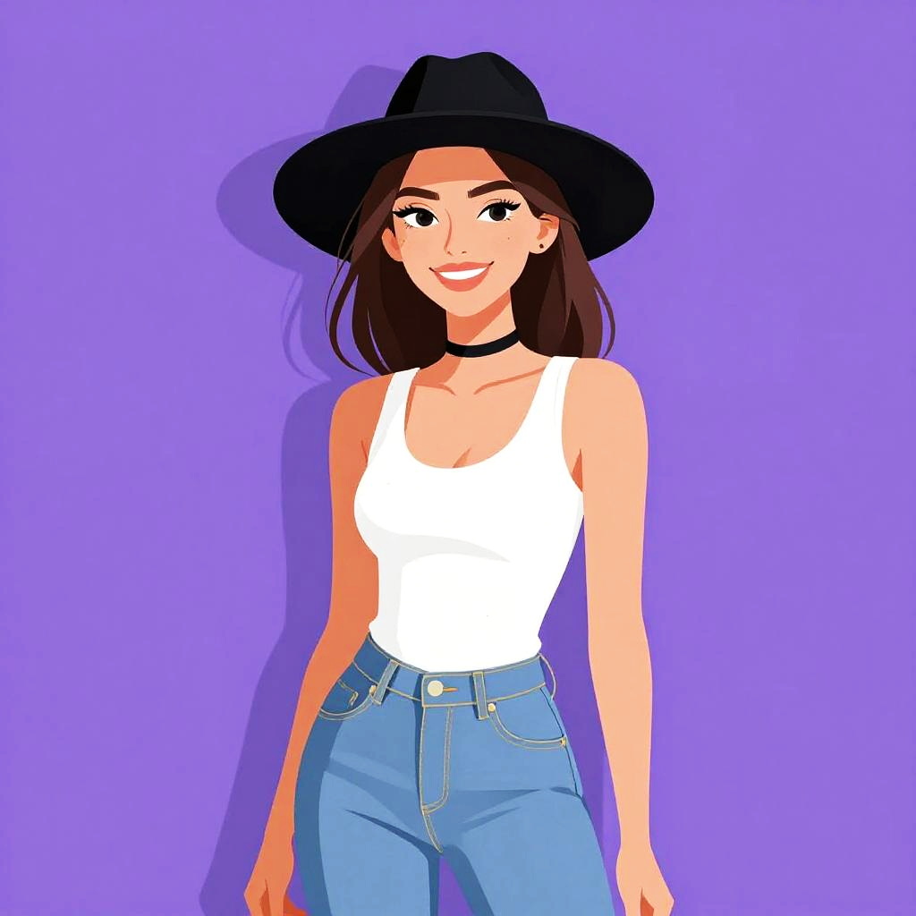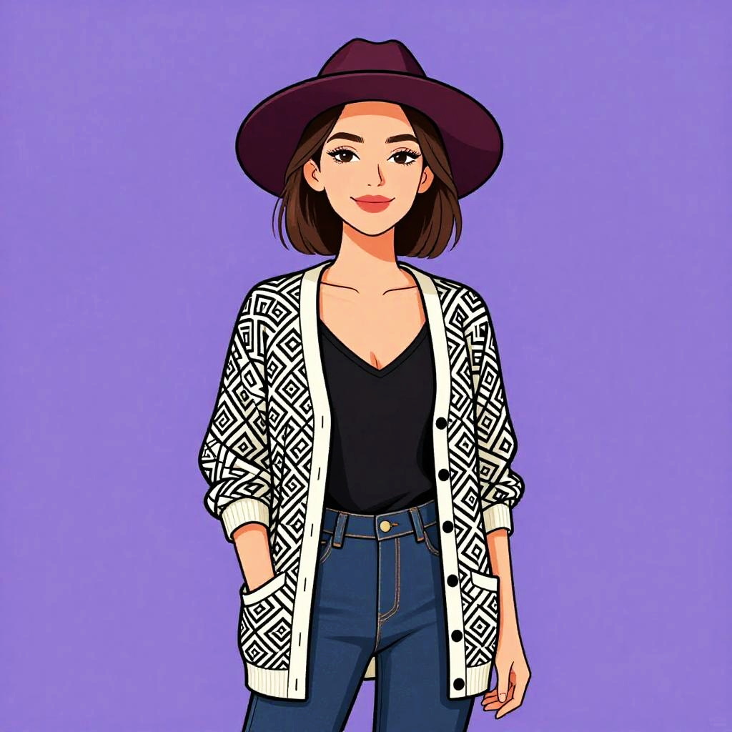 Woman with pretty face and pretty hair. Woman, casual, cowl neck sleeveless blouse with a maroon and white speckled pattern, flowing fit, brown fitted trousers, wide-brimmed tan felt hat. --sref 1467