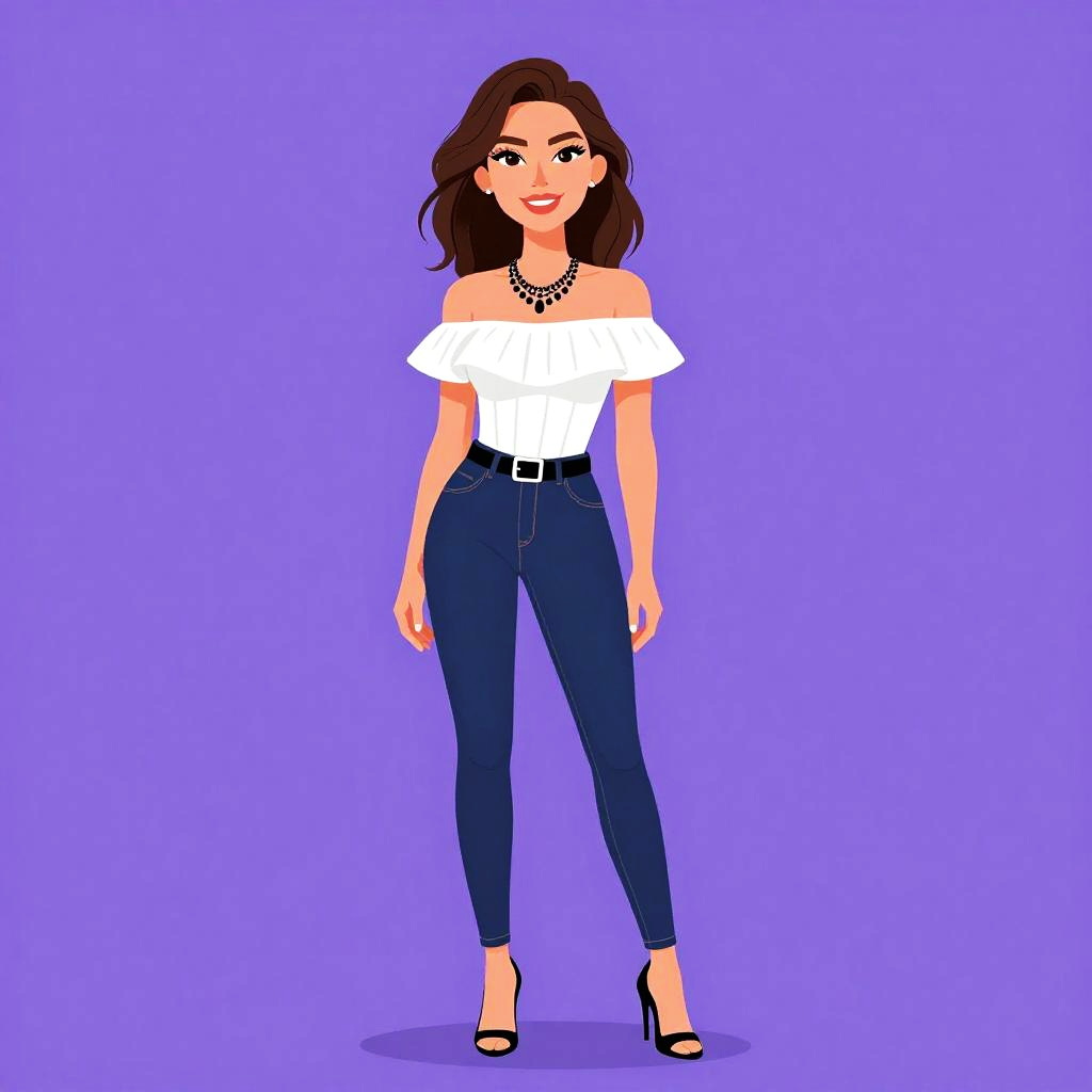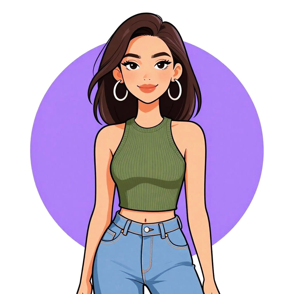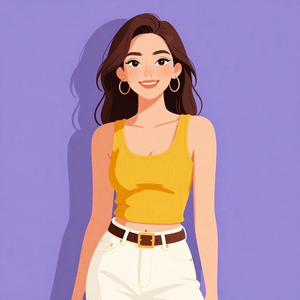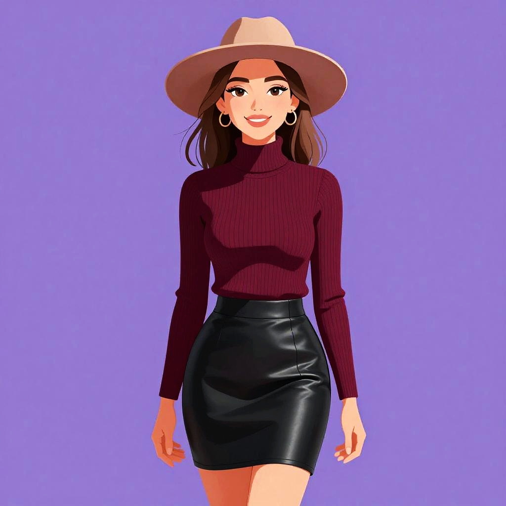 Woman with pretty face and pretty hair. Woman, casual, cowl neck sleeveless blouse with a maroon and white speckled pattern, flowing fit, brown fitted trousers, wide-brimmed tan felt hat. --sref 1467