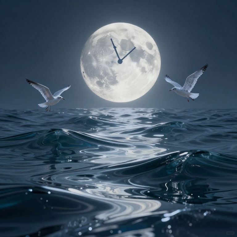 A surreal seascape unfolds with an otherworldly moon rising over a sea that seems to flow like liquid glass, evoking the fluidity of time and space. The moon is shaped like a giant clock face, its hands frozen at midnight, casting a soft, eerie glow across the undulating waves that appear to bend and warp under some unseen force's influence. Delicate seagulls made of lace materialize momentarily before vanishing into the glistening surface, reflecting the whimsical nature of dreams in this enchanting marine wonderland where time is fluid and reality malleable.