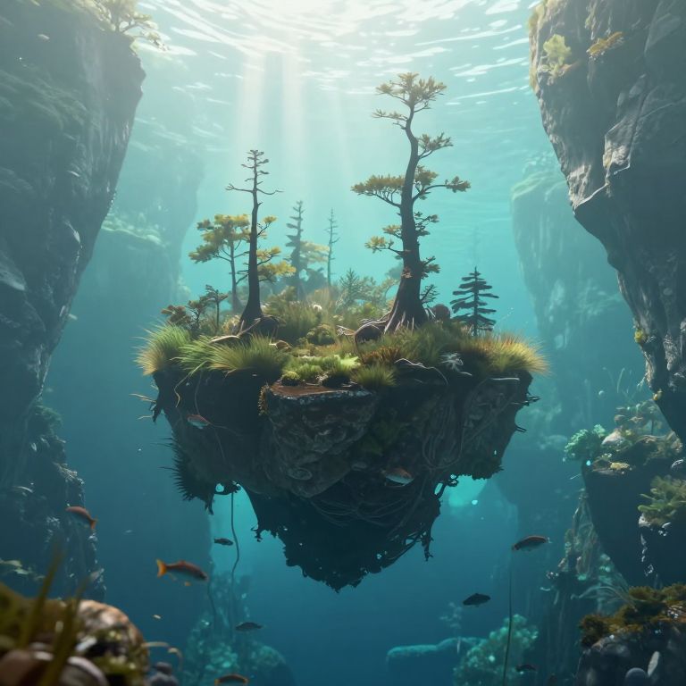 Photograph of a floating island with trees and moss, surrounded by underwater cliffs, sunlight filtering through, with small fish swimming nearby.