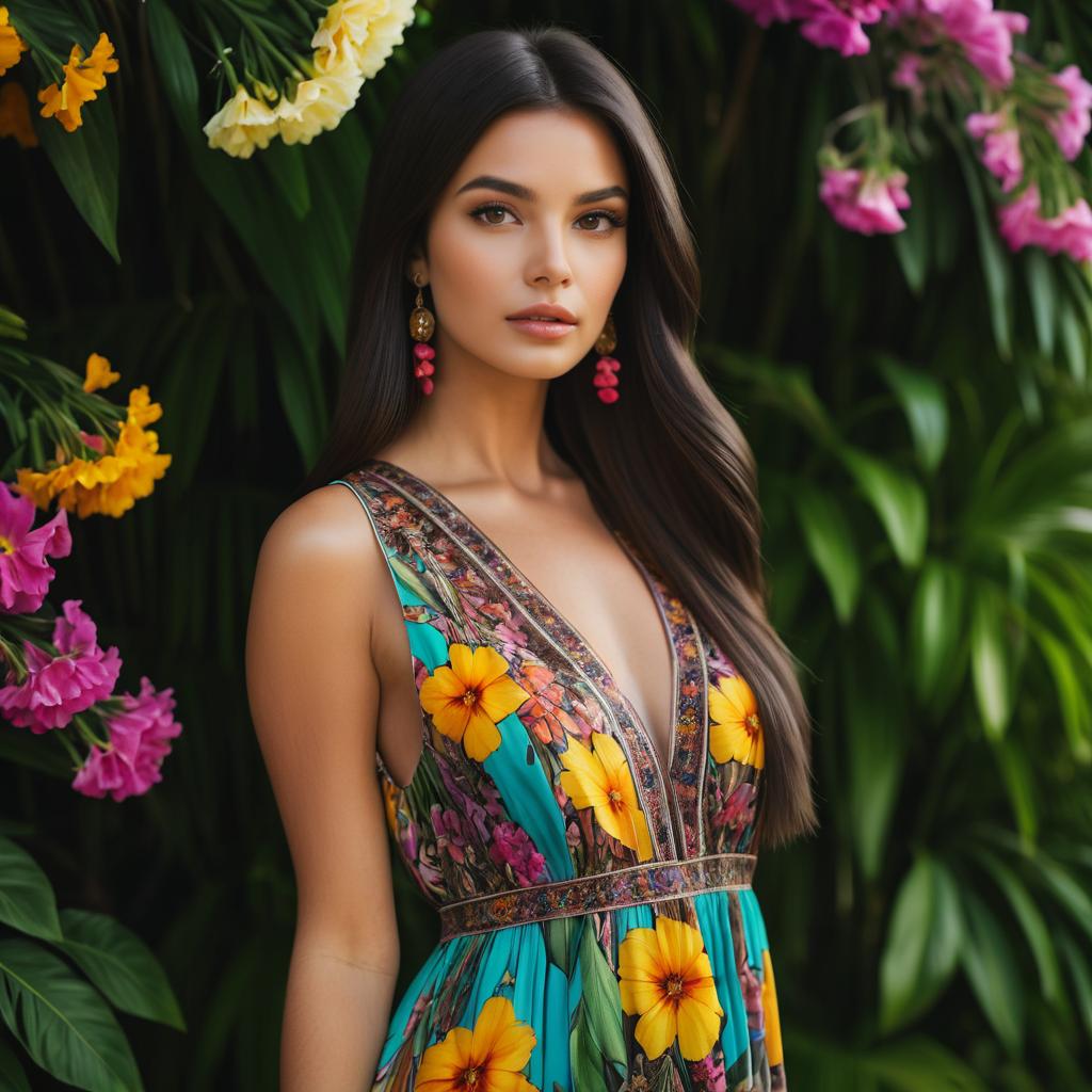 Macro photograph of a stunning woman, 24 years old, with long straight dark brown hair, wearing a bright floral maxi dress, high realism, editorial photography with intricate details.