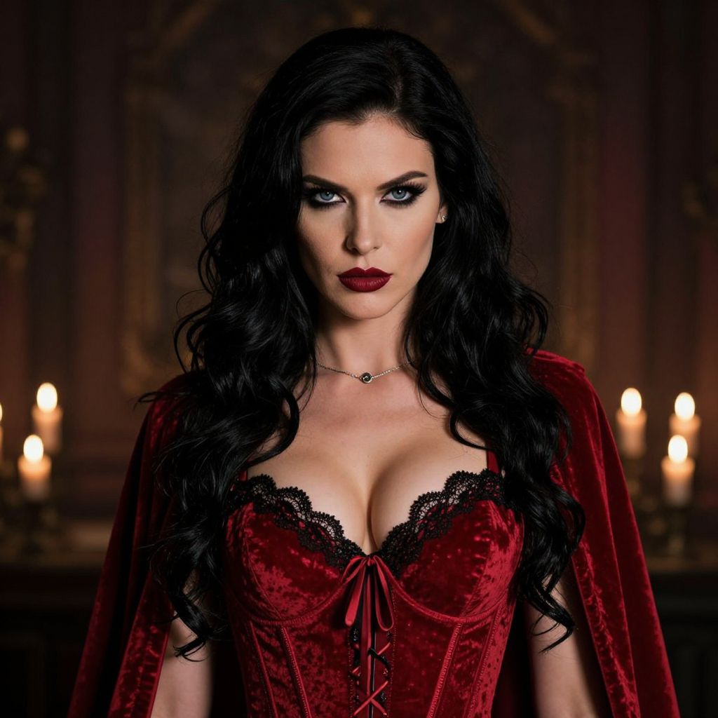 Photograph of a pale-skinned woman with long, wavy black hair and striking blue eyes, wearing a deep red velvet corset with black lace trim and a matching cape. She has dark red lipstick and a delicate silver necklace. The background is dimly lit with an ornate, dark wood panel and several glowing candles, creating a Gothic, mysterious ambiance. Her intense gaze and dramatic makeup enhance the vampire-like aesthetic. The corset accentuates her large breasts, and her overall appearance is seductive and commanding.