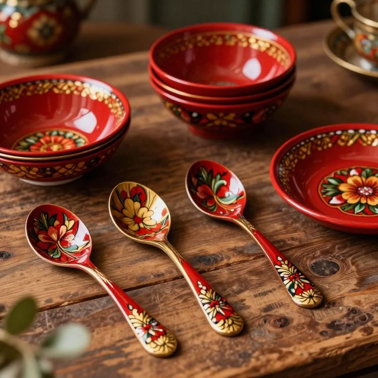 Hohloma style decorative spoons and bowls arranged artistically on a vintage wooden table, featuring vivid red and gold hand-painted floral designs with glossy finish, evoking a warm and cozy traditional Russian folk atmosphere.