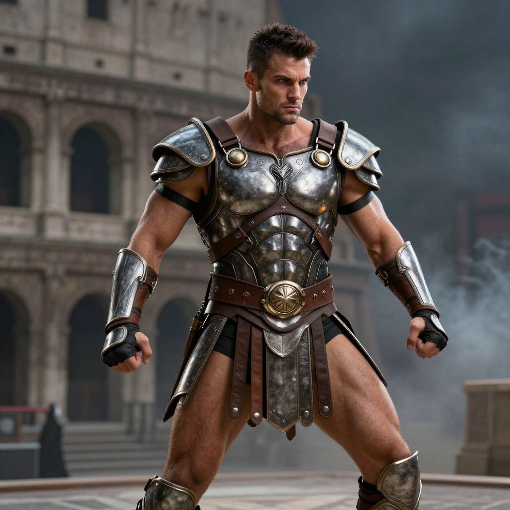 American gladiator costume male, a strong warrior in futuristic gladiator armor with metallic plates and leather straps, fierce stance in a smoky coliseum backdrop, dramatic lighting highlighting muscular build and battle-ready expression, highly detailed and dynamic.