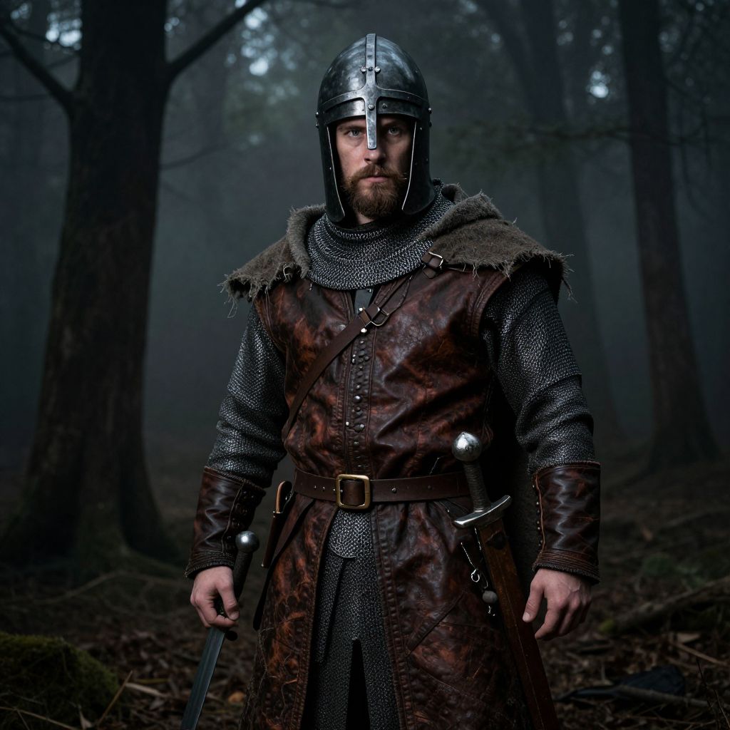 A man with a beard and mustache is wearing a medieval costume with a helmet and a leather jacket. He is standing in a dark, forested area with tall trees and a foggy atmosphere. The lighting is dim, creating a mysterious and eerie ambiance. The man's expression is determined and focused, as if he is on a quest or preparing for battle. The medieval costume includes a chainmail underlayer, a wooden sword, and a tattered cloak. The scene is detailed with textures and shadows to enhance the sense of depth and realism.