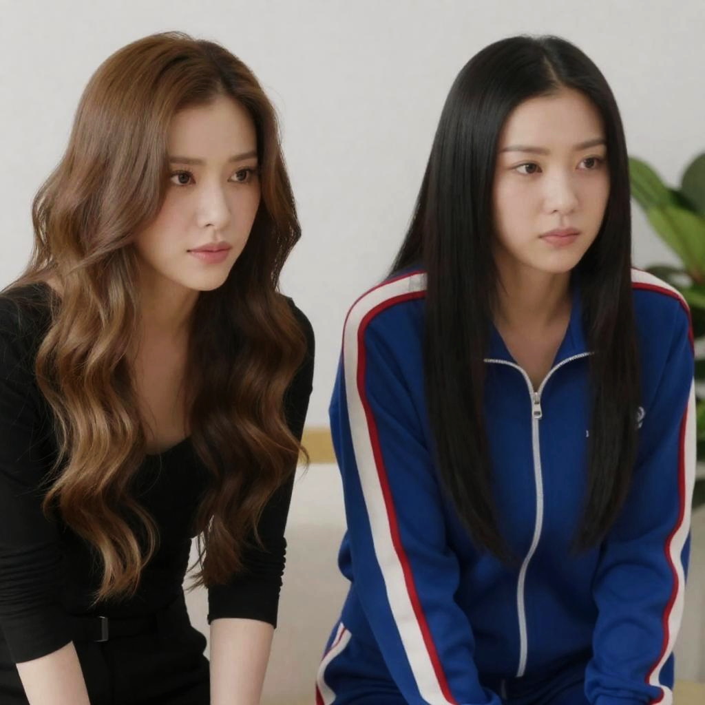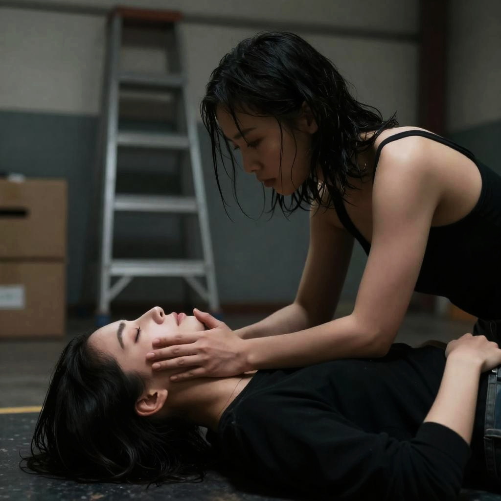 Two women in a room. Woman on left with long black hair, blue tracksuit, eyes closed. Woman on right with wavy brown hair, black long-sleeve top, reaching out to grab left woman's arm. Background has shelves, light, and cabinets. Room has beige walls. Intense interaction, physical touch.
