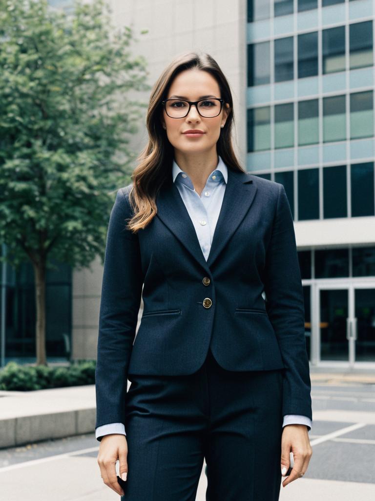 Smart Casual Attire Woman Office Costume, woman in a business suit and glasses standing outside --sref 1399