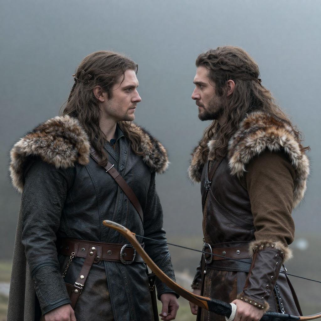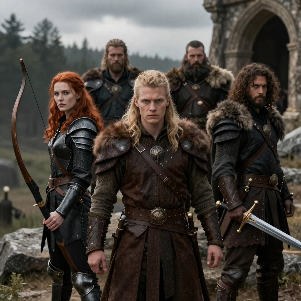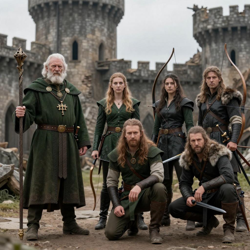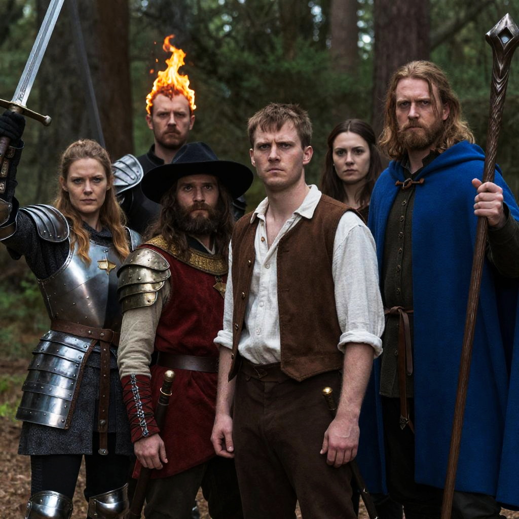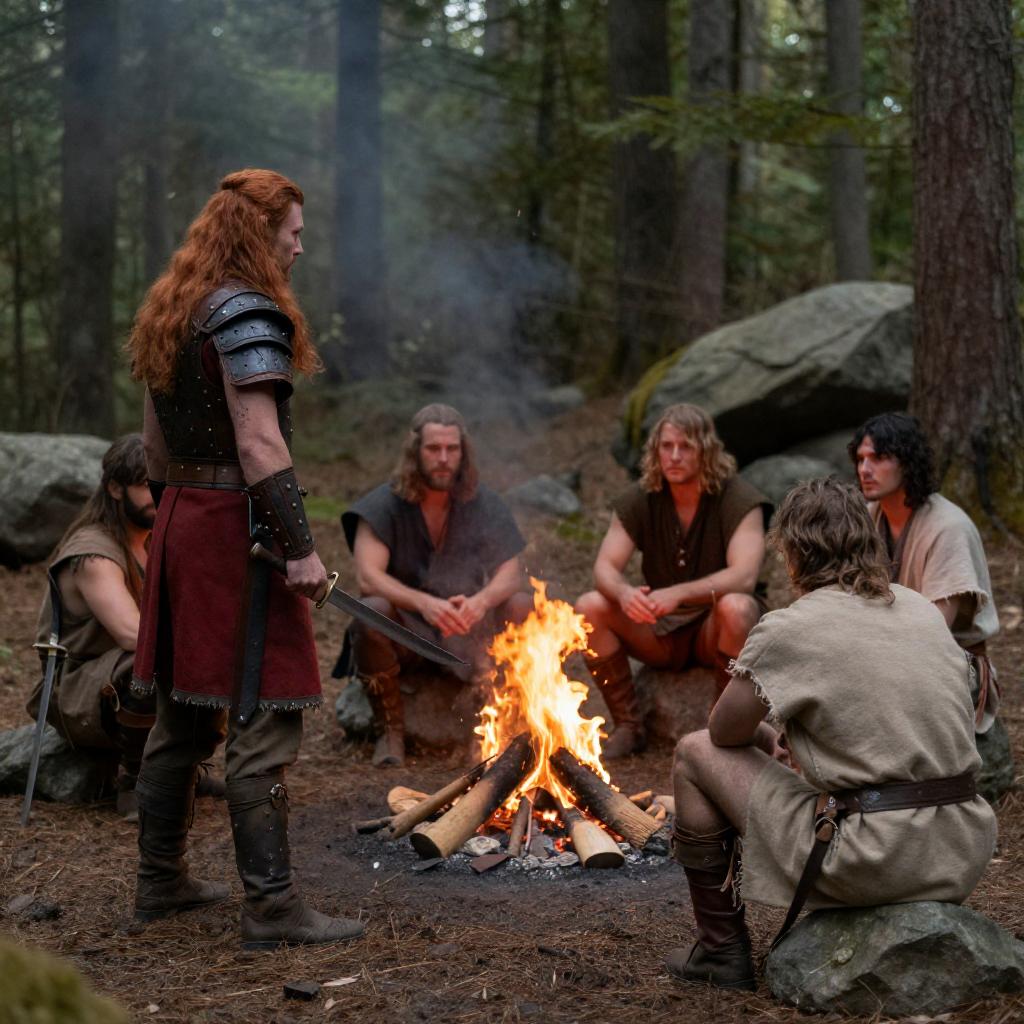 Photograph of a forest scene. A warrior with long red hair, leather armor, and a red skirt stands holding a knife, facing four people sitting by a fire. Three men and one woman, all in primitive clothing, sit around the fire. Trees and rocks surround them. Warrior's right leg propped against a tree. Fire in the center. Warrior's intense gaze directed at the group. Group's expressions neutral. Warrior's sword on ground to the left.
