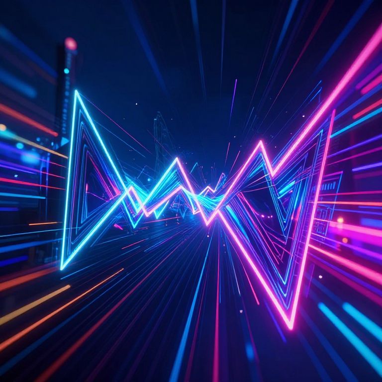 Neon blue and pink zigzag lines radiate against a dark, starry background, creating a dynamic, futuristic, digital art piece.