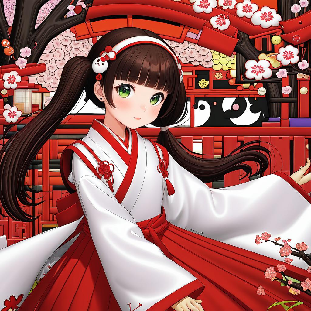 Anime-style illustration of a young miko girl with long brown hair styled in low twintails and blunt bangs. She has green eyes and is dressed in a traditional white and red miko outfit, featuring a white kimono top and a red hakama skirt. The girl wears a white headband with red floral decorations. The background includes vibrant red and black elements with cherry blossom branches, evoking a Japanese shrine setting.