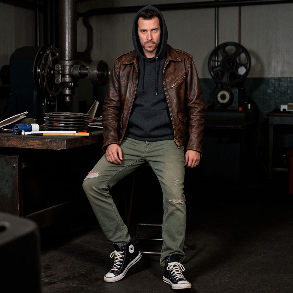 A man, black leather jacket, charcoal turtleneck, slim-fit dark jeans, brown leather boots, gray wool scarf, rustic wooden exterior, overgrown shrubs, flickering porch light, polaroid instant camera style, contemplative expression. Man has masculine face and piercing eyes