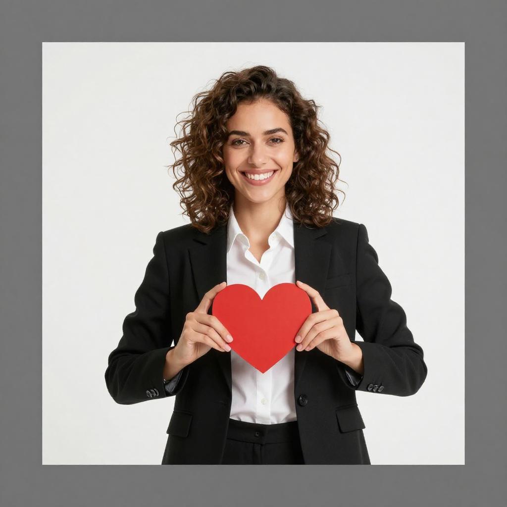 Photograph of a smiling woman with curly brown hair wearing a black blazer over a white shirt. She's holding a bright red heart in front of her with both hands. The background is a plain white square, bordered by a gray frame. Her confident smile and professional attire contrast with the vibrant heart, creating a cheerful and professional vibe.