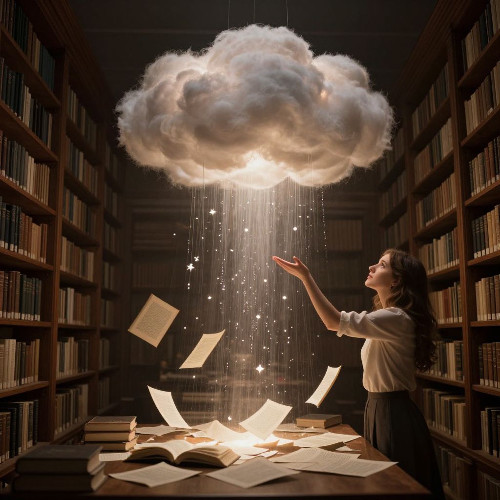 In a dimly lit library, a woman reaches toward a hovering cloud that rains cascades of light, illuminating scattered pages below as if birthing new stories from the air.