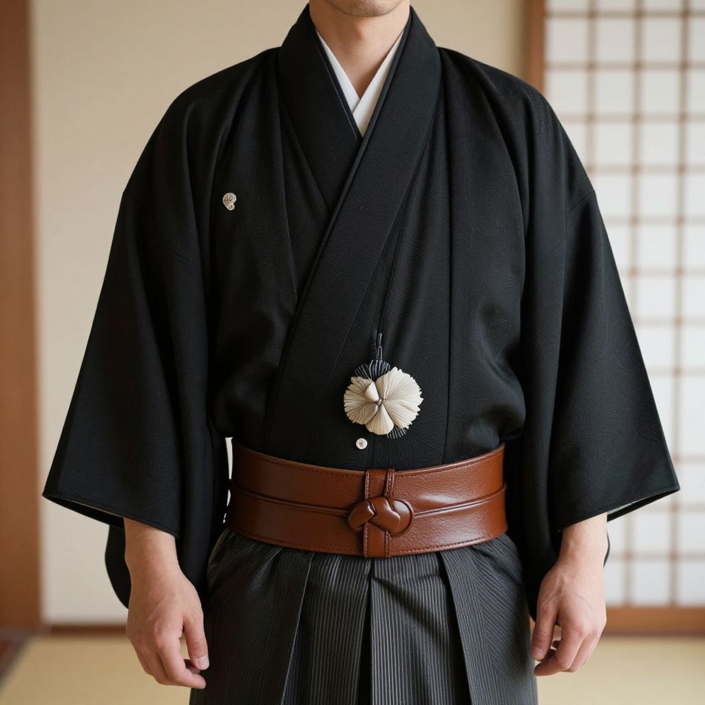 A man wearing a traditional black kimono with a brown belt, exuding a sense of elegance and cultural heritage. The kimono is meticulously tailored, with intricate patterns that reflect Japanese craftsmanship. The man's demeanor is calm and composed, embodying the quiet authority often associated with traditional Japanese aesthetics. The belt, made of rich brown leather, complements the dark tones of the kimono, adding a touch of sophistication. The scene is set in a serene, well-lit environment that enhances the overall aesthetic of the image.