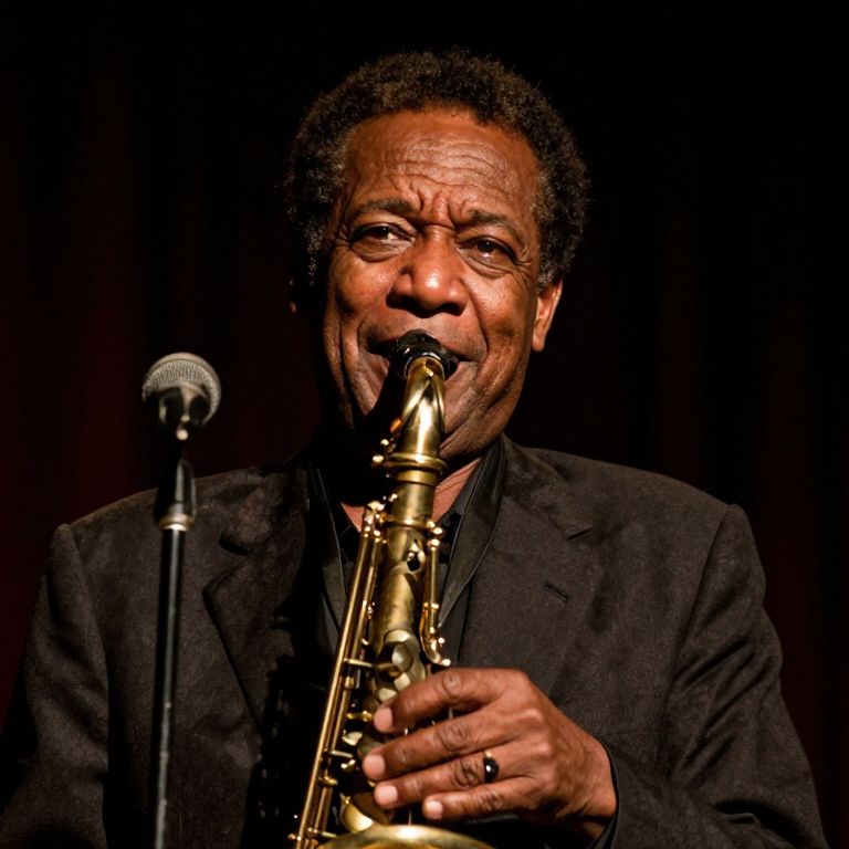 Photograph of an African-American man with short curly hair, medium brown skin, and a warm smile, playing a golden clarinet. He wears a black blazer over a black shirt, and a microphone is positioned in front of him on the left. The background is dark, emphasizing the subject. His eyes are slightly squinted, and he has a few wrinkles on his face, indicating age. The lighting highlights his face and the clarinet, creating a focused, intimate atmosphere. The image captures a moment of musical performance.