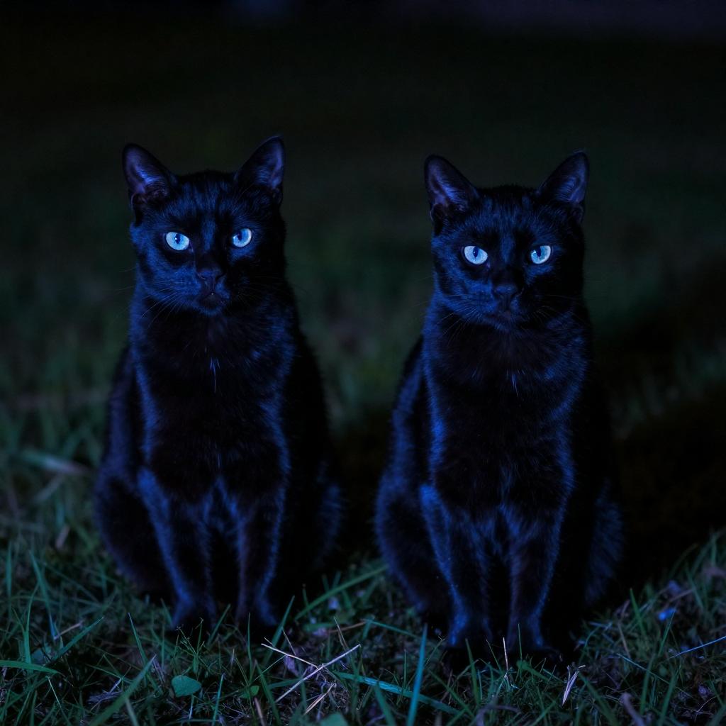 Photograph of two black cats sitting on grass at night, illuminated by blue light. Both cats have glowing blue outlines. Dark, grassy background. Cats facing forward, intense blue light highlights their eyes and fur. Two cats.