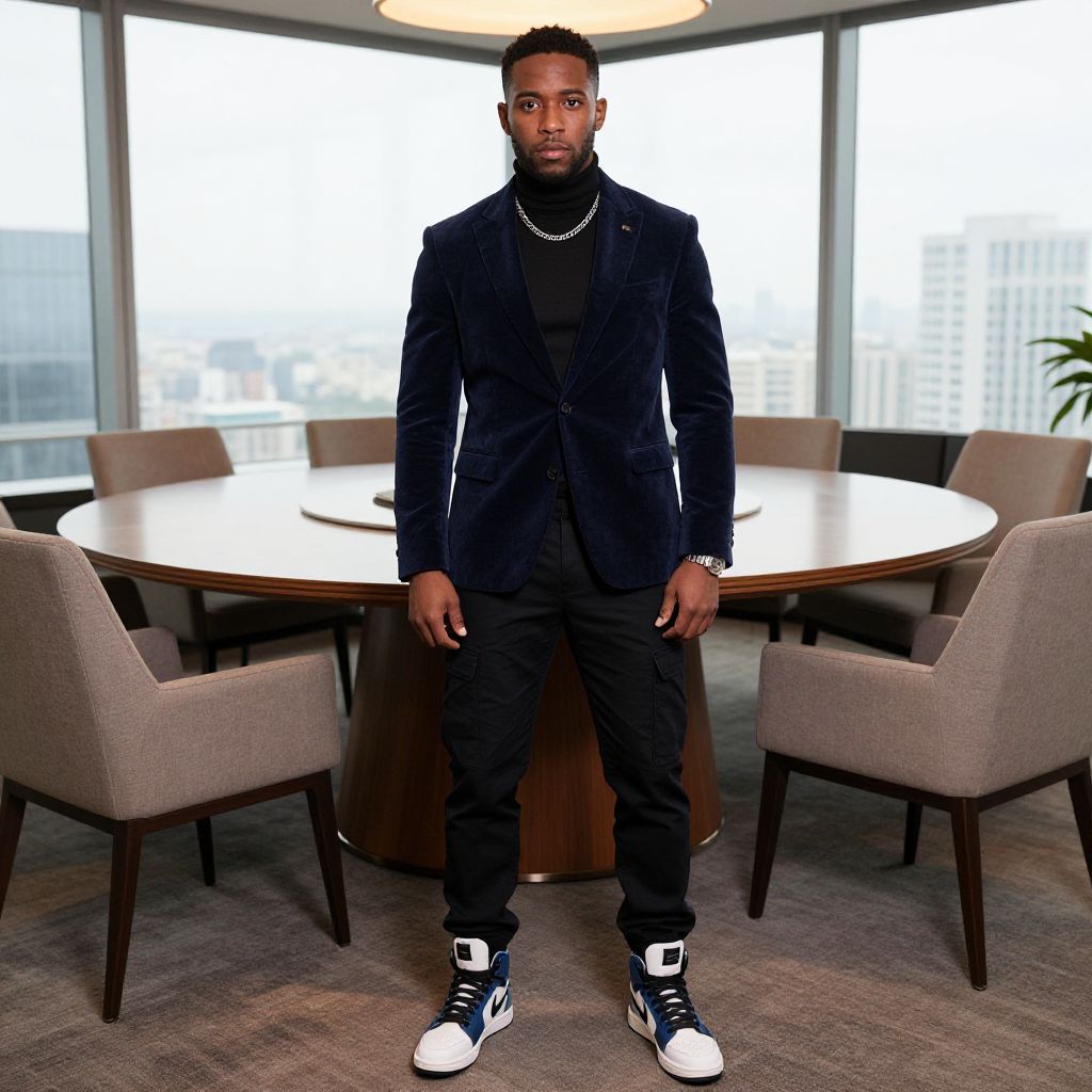 A man, navy velvet blazer, fitted black turtleneck, tapered cargo pants, high-top designer sneakers, silver chain necklace, cozy meeting room, large round table, floor-to-ceiling windows with city views, polaroid instant camera style, confident expression. Man has masculine face and piercing eyes