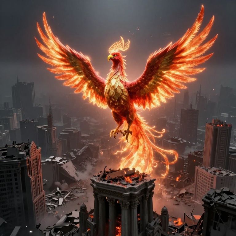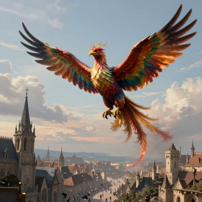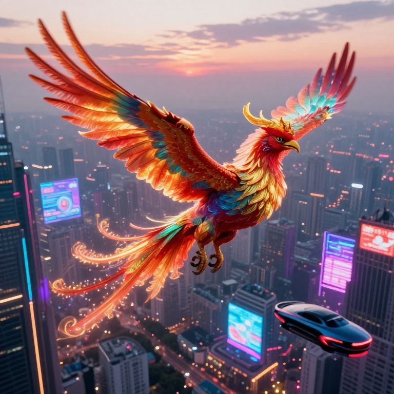 A vivid digital illustration depicts a majestic, red phoenix with golden accents perched on a futuristic, ornate clock tower piercing through misty clouds. The phoenix's wings are spread wide, showcasing vibrant red feathers with yellow tips. The clock tower features intricate, metallic designs and a large, circular clock face, with its spire piercing the sky. Below, a winding road snakes through a lush, forested landscape, partially obscured by mist. The sky is bright blue, contrasting with the dense, green forest and the dark, metallic clock tower. The overall style is fantasy with a high level of detail.