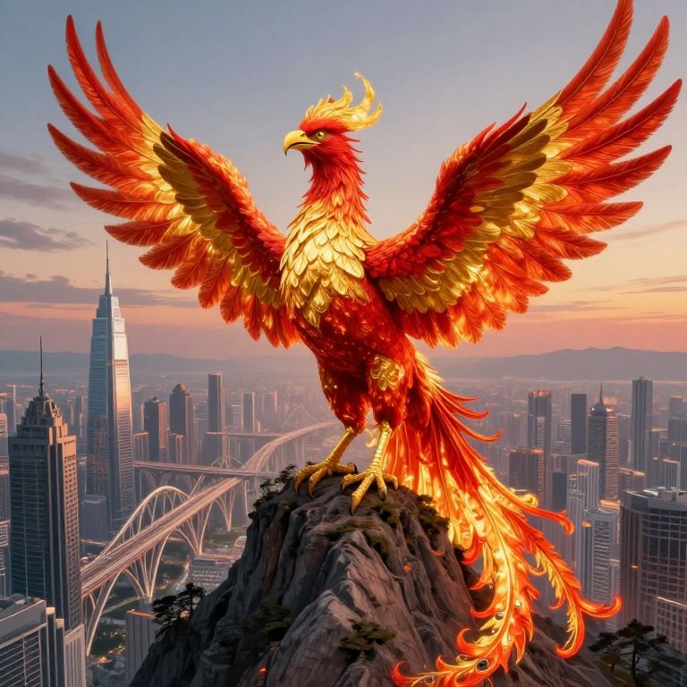 Digital art: Vibrant red phoenix with golden accents perches on a clock tower amidst misty mountains, with winding roads below.