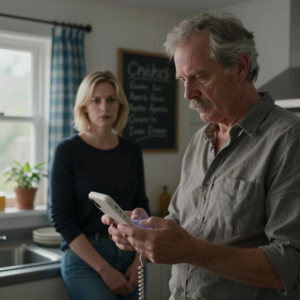 Two men in a kitchen. The left man, middle-aged, balding, wearing a gray shirt, holding a coffee mug. The right man, older, long blonde hair in braids, beard, sleeveless yellow and black shirt, looking up at the left man. White cabinets, fridge with magnets, open door in background. The left man's shirt has pink and white stripes. The right man has tattoos on his arms.