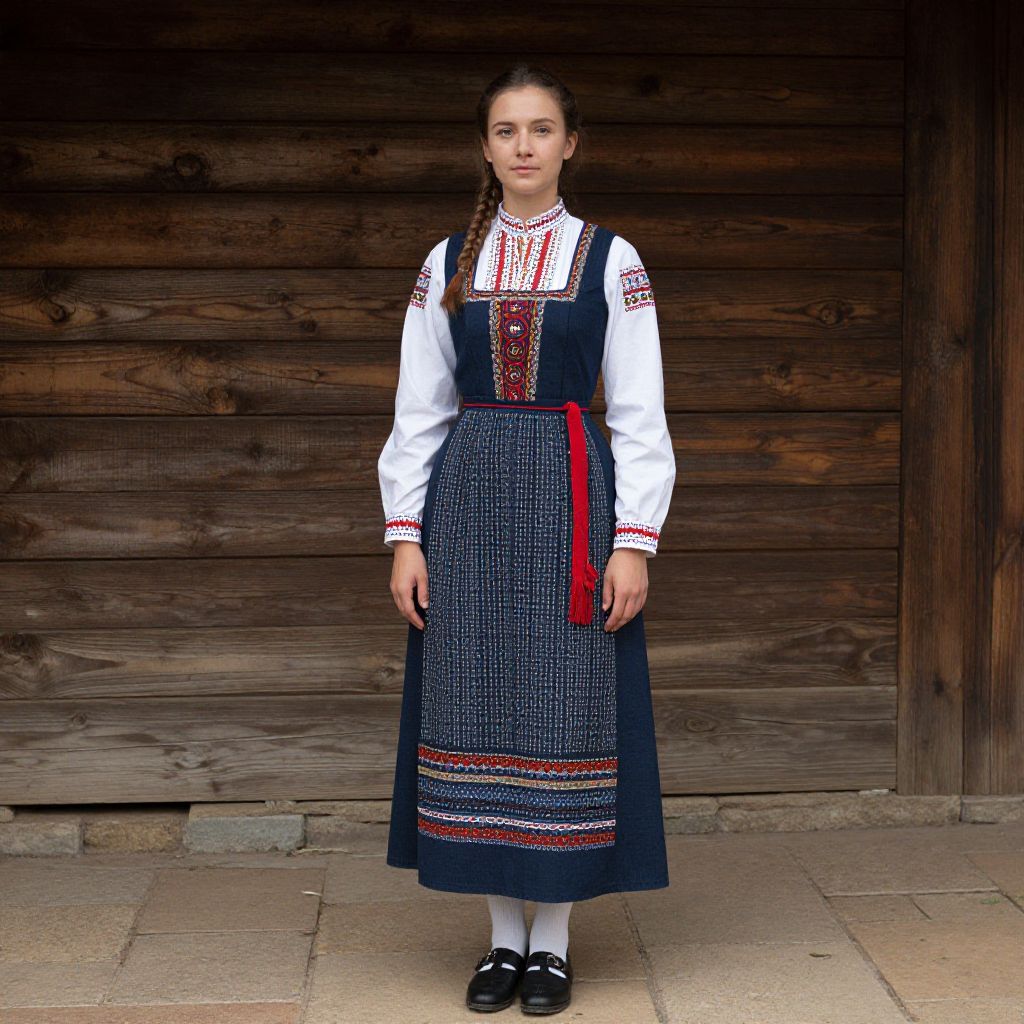 "Vintage Folk Dress, woman in traditional dress standing in front of a wooden wall"
