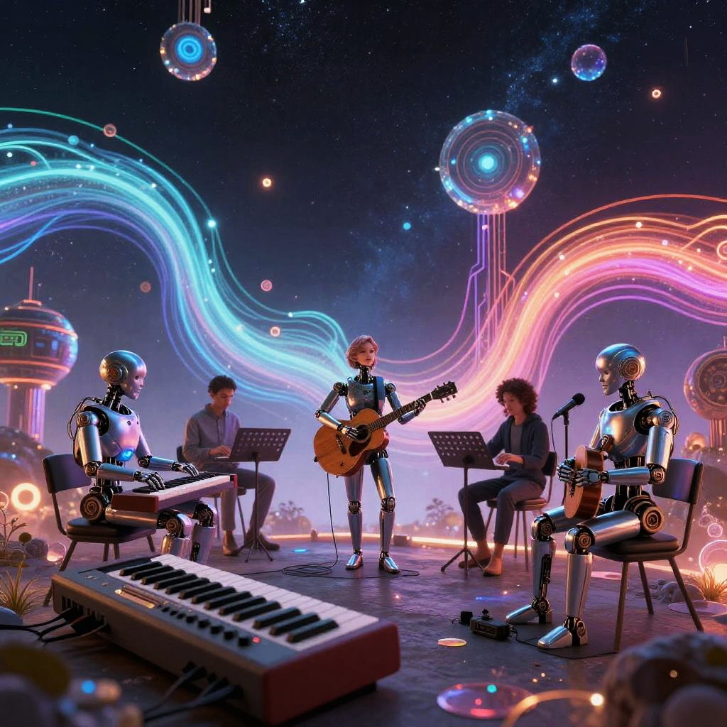 Tomita style musical sci-fi universe, blending cosmic landscapes with vintage synthesizer elements, vibrant color palette with glowing circuits and abstract sound waves, dreamy and immersive atmosphere, detailed robotic musicians performing under starry skies.