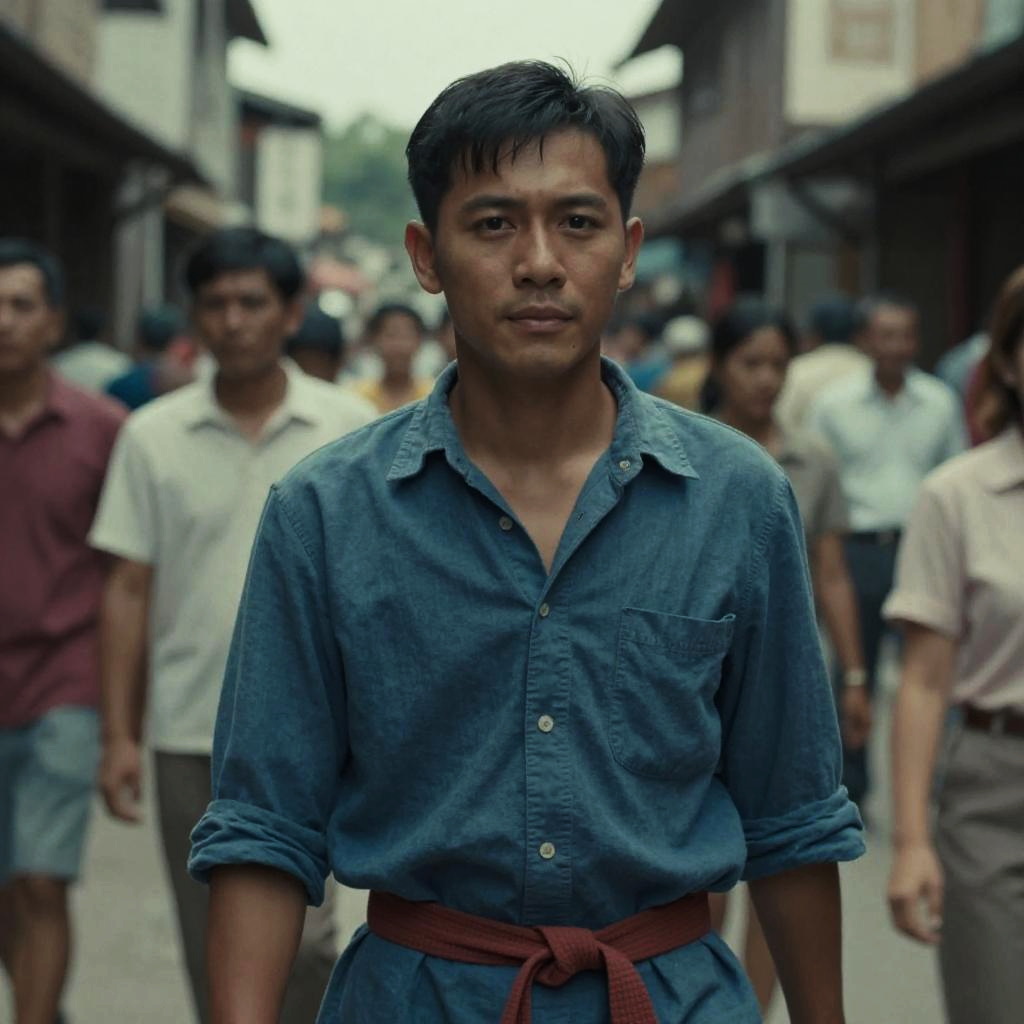 Jiro Mha, man in a blue shirt and red belt standing in a crowded street --sref 1438
