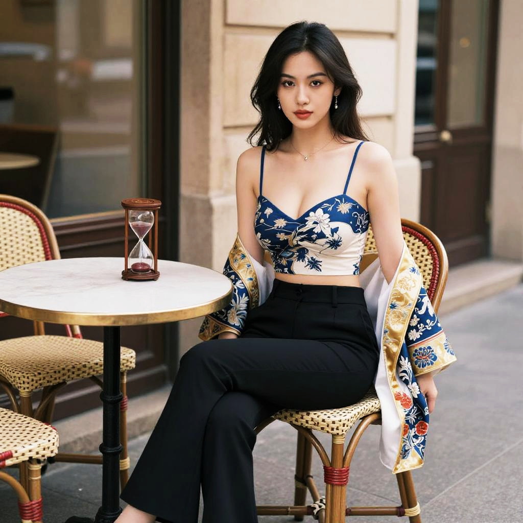 A hourglass woman in a casual chic outfit featuring a cropped blue and white camisole and high-waisted black flared trousers, styled in AgfaColor film, seated at a sidewalk café in Paris. Sexy. Pretty face and beаutiful eyes. Big breasts BREAK chinese, asian, traditional Chinese aesthetics, delicate brushwork, ink wash painting textures, vibrant red and gold accents, elegant Asian female, silk fabrics, ornate patterns, soft lighting, ethereal atmosphere