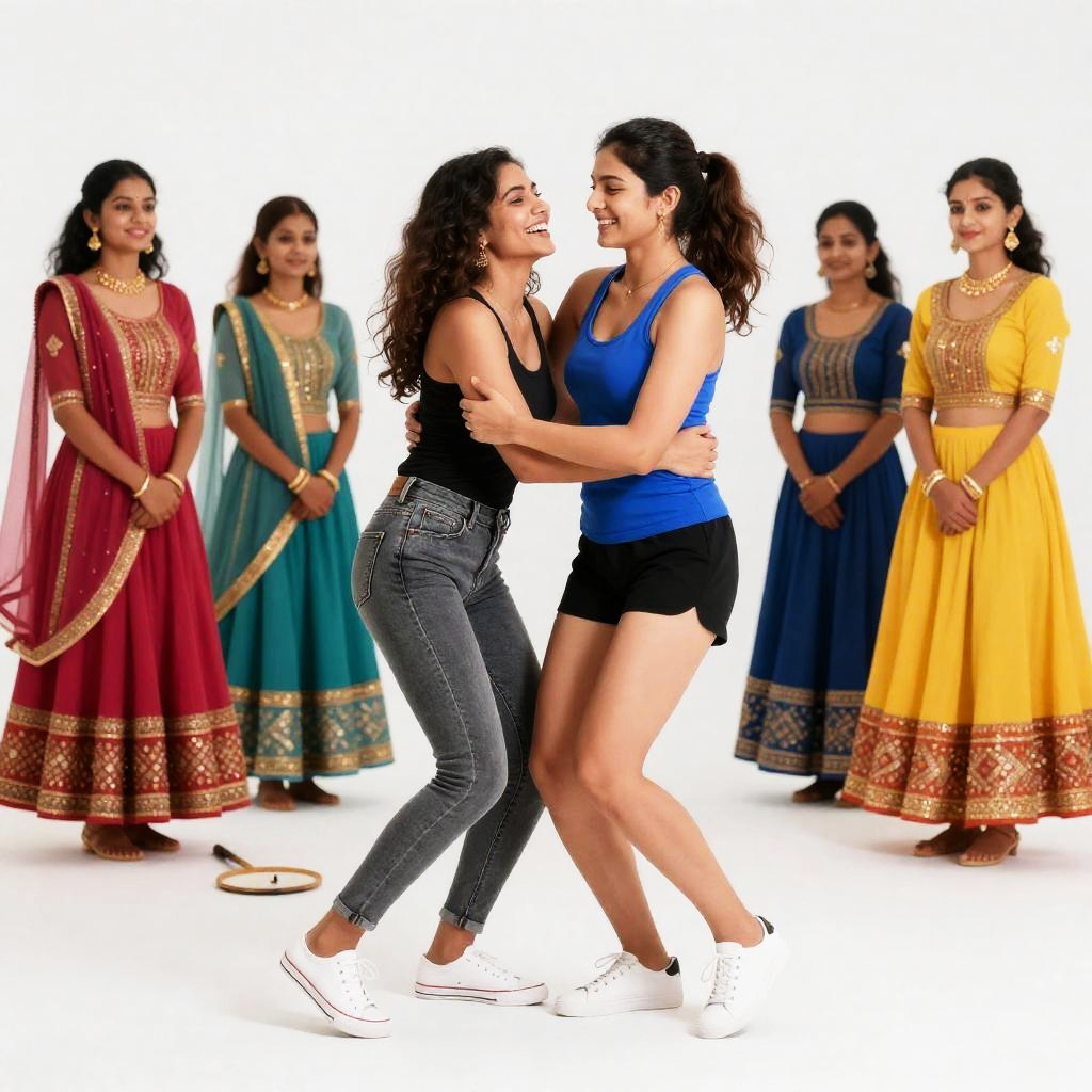 Two young women smiling and dancing together in casual modern clothing, one wearing a blue tank top and black shorts, the other in a black tank top and gray jeans, both with white sneakers. In the background, five women wearing colorful traditional Indian ethnic dresses (lehenga choli) in red, teal, blue, and yellow with gold embroidery, all standing against a bright white studio background. A badminton racket is lying on the floor near the dancers.