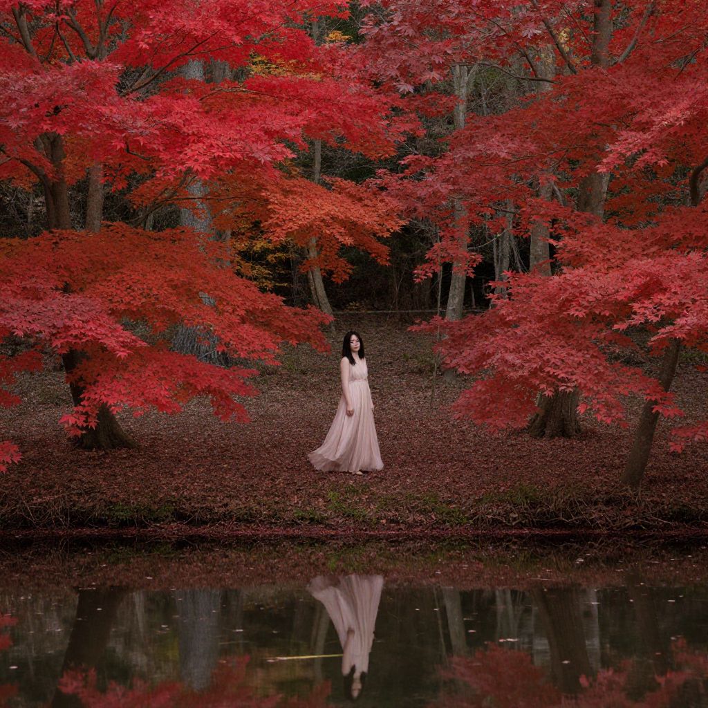 Silent forest whispers through vibrant red maple trees as a lone woman in a flowing dress stands amidst a carpet of falling petals, her reflection mirrored in the tranquil water below.