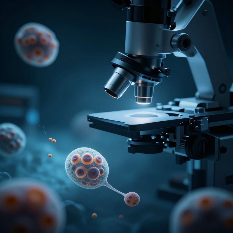 This digital CGI image depicts a close-up of a modern microscope focusing on several spherical, translucent organisms with orange and white centers, resembling viruses. The microscope, positioned on the right, has a metallic, industrial design with a blue-tinted light illuminating the scene. The background is a dark blue gradient, creating a clinical, scientific atmosphere. The spheres, with intricate, spherical structures within, float in various sizes and positions, emphasizing depth. The image uses a high contrast and sharp focus on the microscope and nearest virus, while the background and distant viruses are blurred, enhancing the sense of microscopic scale.