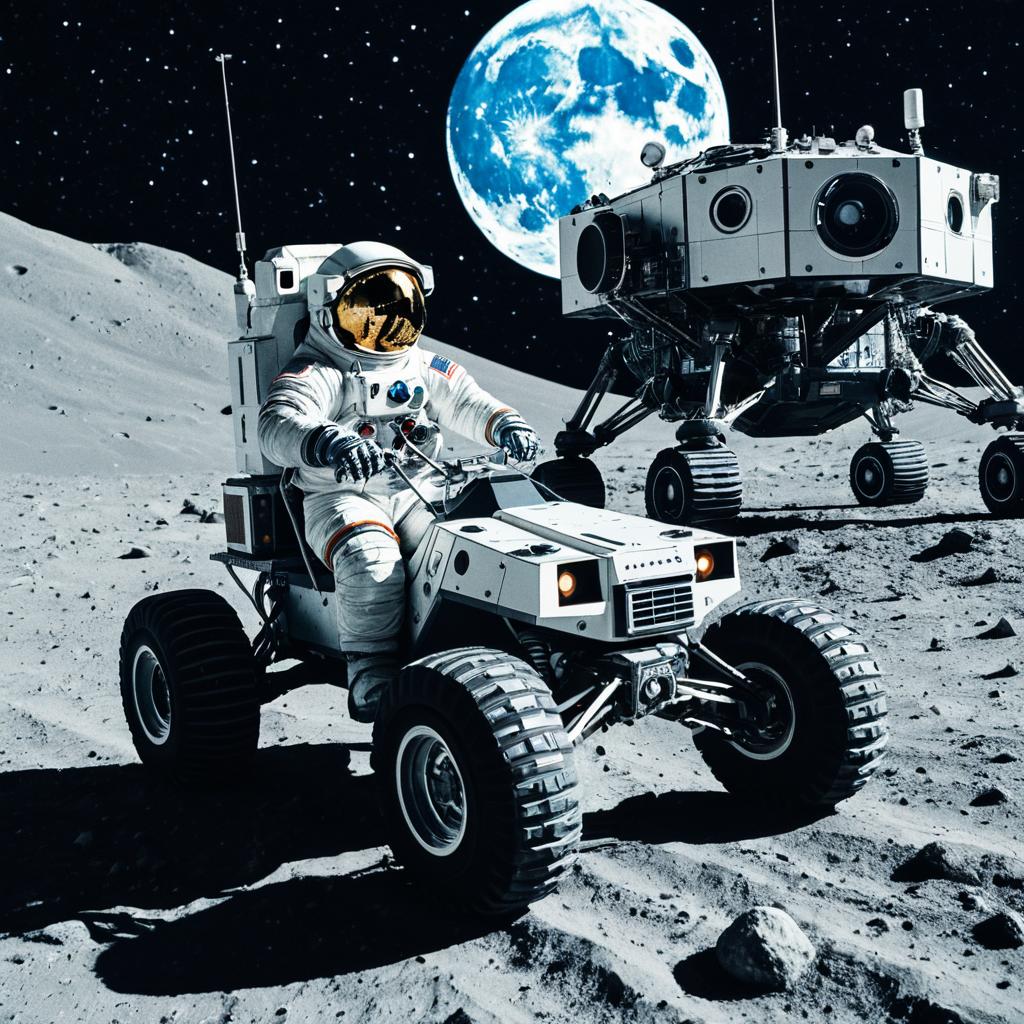 Parallelogram astronaut riding a moon rover in front. A very big cenotaur in the background trying to eat the whole picture, science fiction with silver, blue, white, black colors, 8k, psychedelic, 16X9 - Upscaled by.
