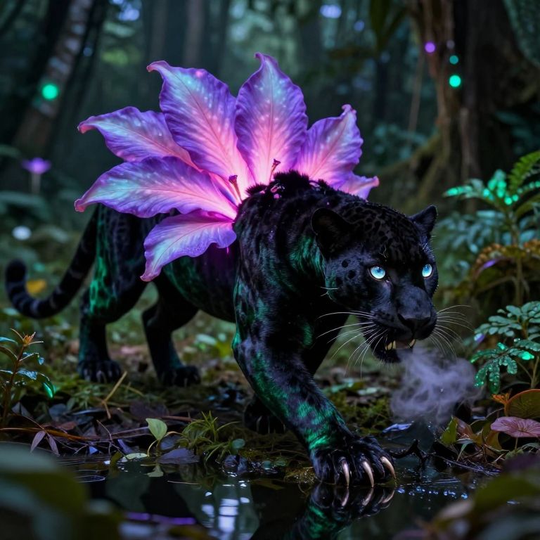Picture a creature that combines the sleek menace of a panther with the delicate beauty of a blooming flower, Its body is feline, covered in black, velvety fur that shifts to deep emerald green at the tips, Along its spine grow large, bioluminescent petals, each unfurling like a nocturnal flower, glowing softly in hues of purple and pink, The creature’s paws are large and padded, with claws resembling thorny rose stems, Its face is unmistakably panther-like, but its eyes are crystalline, resembling dew-drops caught in moonlight, When it growls, a faint, floral fragrance fills the air, Position this hybrid in a twilight jungle where phosphorescent plants thrive, It slinks silently through the dense underbrush, the glowing petals on its back blending seamlessly with the bioluminescence around it, As it pauses by a moonlit pond, its reflection reveals a mesmerizing juxtaposition of predatory stealth and botanical grace
