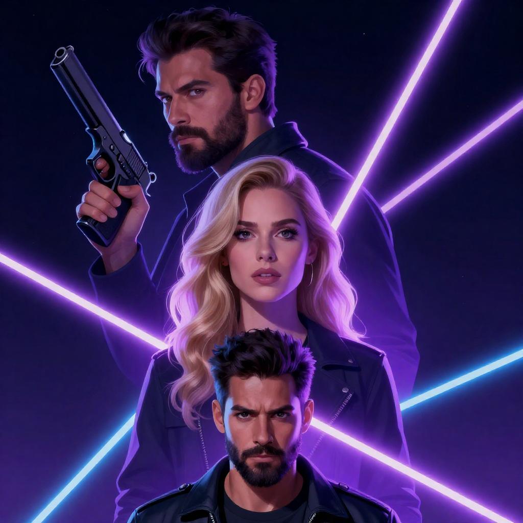 Photograph of three people against a fiery, dynamic background. Centered man in navy suit, intense expression, hands behind waist. Redhead woman in red dress on left, seductive gaze. Redhead woman in gray sports bra on right, serious expression. Large, glowing face in background. Orange and yellow flames, circular grid overlay. All three people standing close together.