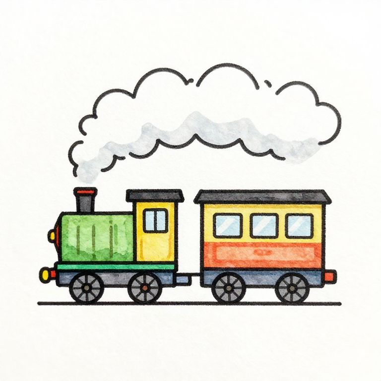 Easy train drawings in ink and watercolor style, simple outlines and soft color fills, focusing on a vintage train with steam and smoke puffs, cartoon-like proportions, ideal for easy artistic tutorials and kids' art projects