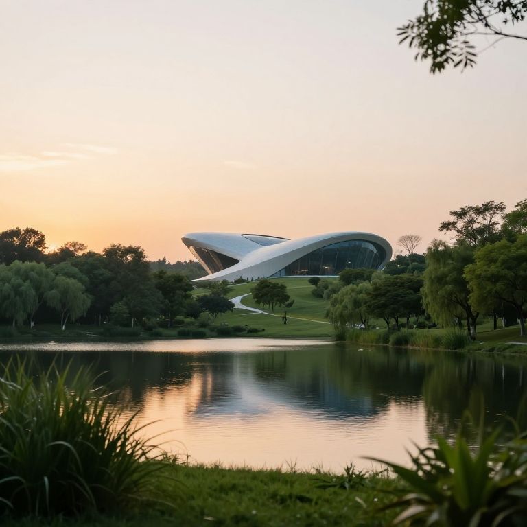 Photograph of a modern, futuristic building with a sleek, white, curvilinear design, set amidst a lush green park. The building, with its distinctive swooping roof and large glass facade, reflects on a calm, mirror-like lake in the foreground. The sky transitions from orange to pale blue at sunset, casting a warm glow. Trees and shrubs frame the scene, with grass and reeds in the bottom corners. The water's surface is smooth, creating a serene ambiance. The building is centrally located, with the lake stretching horizontally across the image.