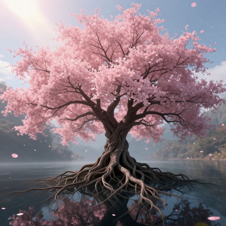 Digital artwork of a solitary cherry tree with pink blossoms standing in a calm, reflective lake, with sunlight filtering through.