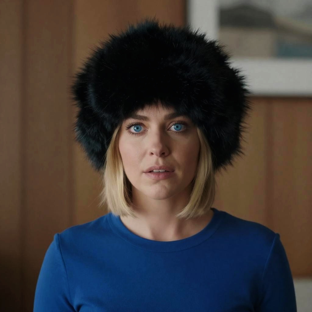 Photograph of a woman with short blonde hair wearing a large black fur hat and a blue outfit. She has intense blue eyes and a slightly surprised expression. Background features wooden panels and a blurred window. She is centered in the frame.
