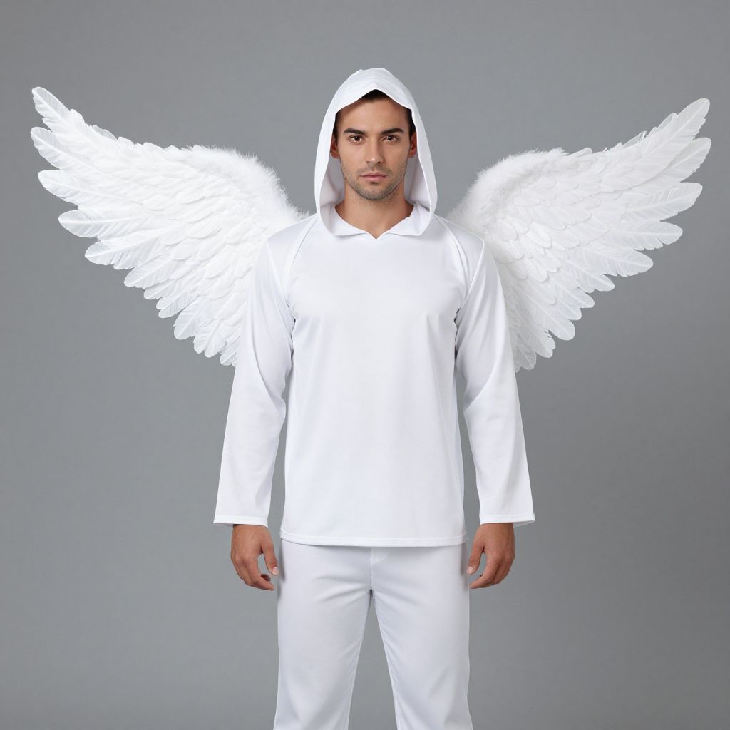 "White Angel Man Costume, man in white angel costume with white wings and a white hood"