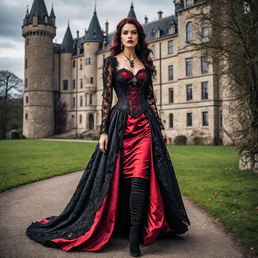 Photo of a Oval woman, Side Swept, rbd outfit, red and black dress with gothic style, lace details, corset top, Silk fabric, knee-length with dramatic flair, dark elegance, Aubergine accents, high heels, historical castle, coderino