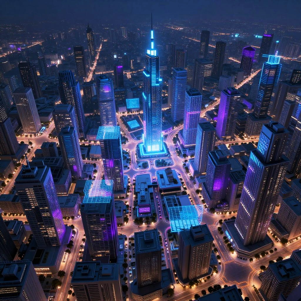 AI city map generator visualizing a sprawling cyberpunk city, detailed map with layered districts, roads and transit lines lit in blue and purple hues, high-tech aesthetic, abstract architecture, grids and zones with holographic effects, immersive and futuristic style.