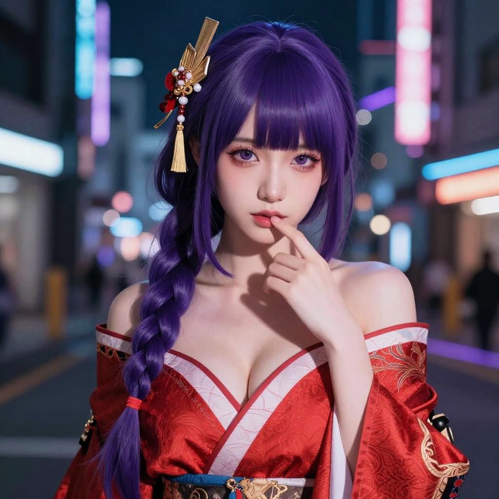 Photorealistic, realistic, realistic details, detailed, (((1 girl, solo, medium breast, slender, thing thigh, thigh gap, yuna (ff10), yffx, miko outfit, sash, detached sleeves, hair ornament, purple hakama, hakama skirt, holding staff, portrait, blurry background, depth of field, sharp focus, focus on face