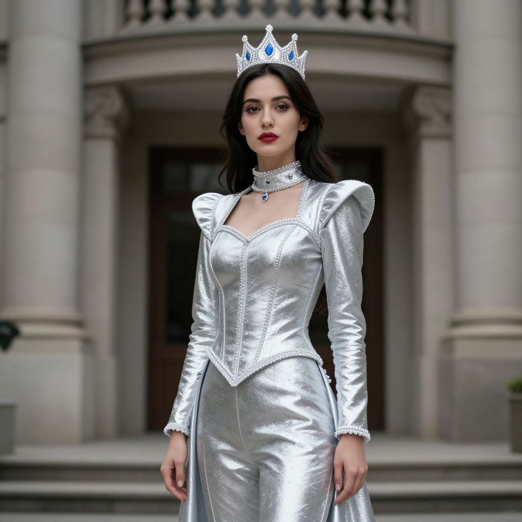 Photograph of a fair-skinned woman with dark, wavy hair wearing a silver metallic gown with puffy shoulders and a fitted bodice, adorned with intricate beadwork. She also sports a silver crown with blue gems and a matching choker necklace. Her red lipstick contrasts with her pale complexion. The background features a grand, classical building with tall columns and a stone balcony. The woman stands confidently in the foreground, centered in the image. The overall style is regal and fantasy-like, reminiscent of a fairy tale princess.