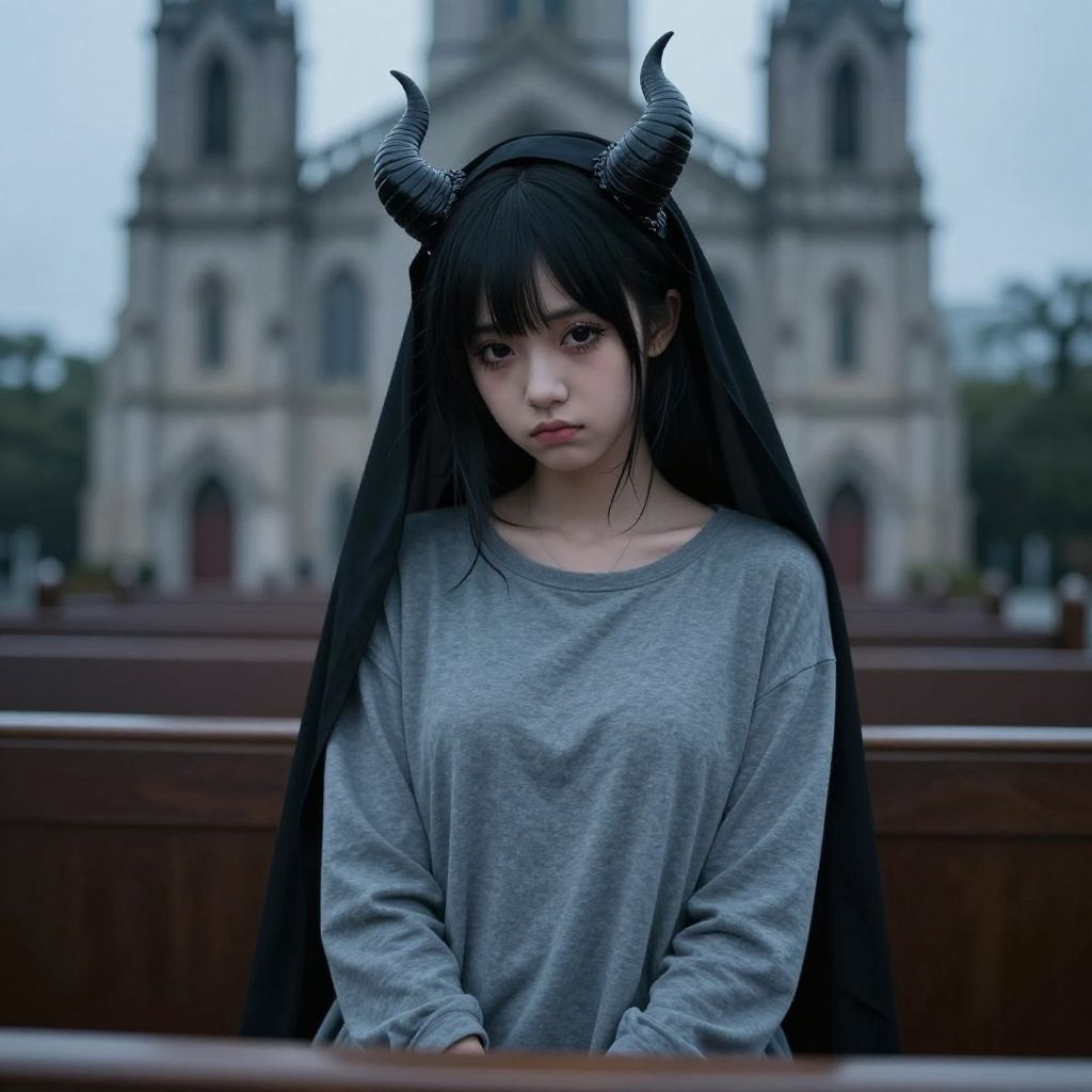 Masterpiece, (9:00 am) overcast, dim sapphire glow, Rembrandt lighting, photorealistic, sharp focus, 1girl, 26-year-old succubus, (cute: 1.5) (petite: 1.3), black hair, (bushy ponytail: 1.3), (small, subtle horns: 1.8), (tiny body: 1.5) (160cm height: 1.5) (small breasts: 1.5) With Thick Eyelashes, small mouth, (realistic skin texture: 1.3), dark hazel eyes, (extremely delicate: 1.3), at home, at ( Holy Family Catholic Church ), in the pews, kneeling, wearing a (loose, boxy, grey long-sleeve (crew-neck shirt: 1.5)), and a (black mantilla), (a little bored)