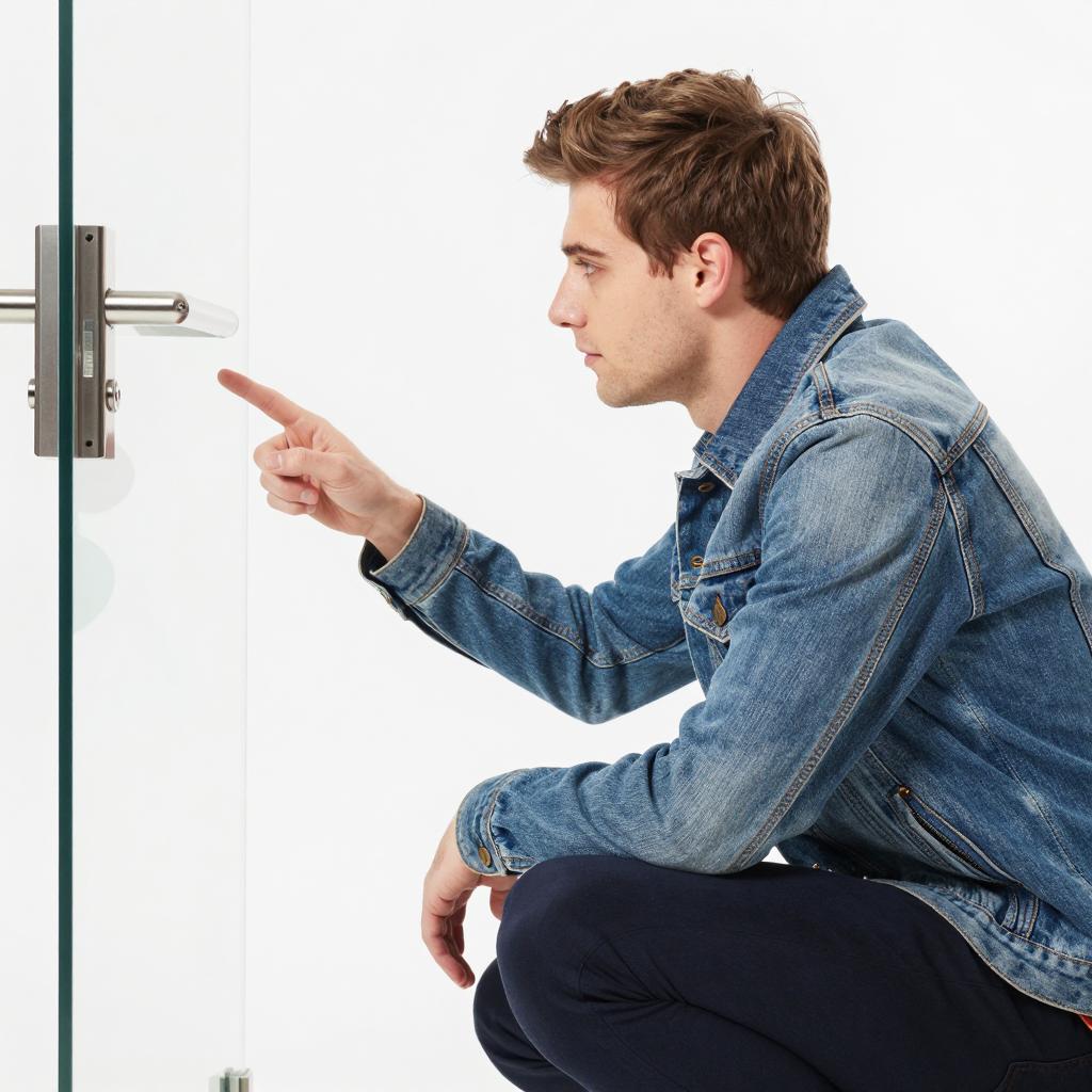 Photograph of a young man with short brown hair, wearing a blue denim jacket and dark pants, crouching and pointing at a glass door with a silver handle. Bright white background. Side profile, focused expression.