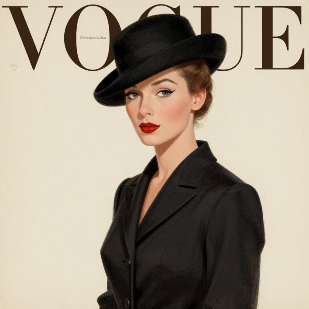 A vintage-inspired Vogue cover featuring a woman in a classic black hat and suit, rendered in a high-definition digital illustration reminiscent of mid-20th-century fashion photography, evoking the timeless elegance of Rene Bouet-Willaumez's iconic 1941 artwork.
